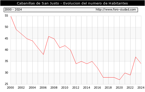 el numero de habitantes en Cabanillas de San Justo era de 34, 3 habitantes menos que el en el año 2023. En el grafico siguiente se puede ver cuantos habitantes tiene Cabanillas de San Justo a lo largo de los años.