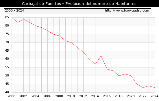 Segun los datos publicados por el INE a 1 de Enero de 2024 el numero de habitantes en Carbajal de Fuentes era de 43, 1 habitantes menos que el en el año 2023. En el grafico siguiente se puede ver cuantos habitantes tiene Carbajal de Fuentes a lo largo de los años.