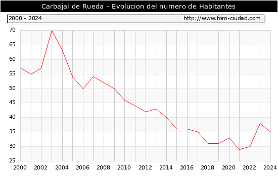 el numero de habitantes en Carbajal de Rueda era de 35, 3 habitantes menos que el en el año 2023. En el grafico siguiente se puede ver cuantos habitantes tiene Carbajal de Rueda a lo largo de los años.