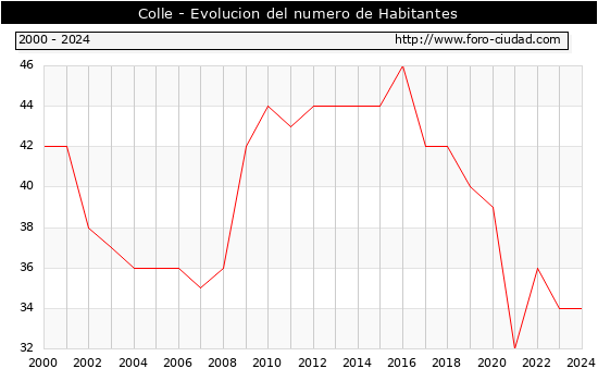 el numero de habitantes en Colle era de 34, igual numero de habitantes que el en el año 2023. En el grafico siguiente se puede ver cuantos habitantes tiene Colle a lo largo de los años.