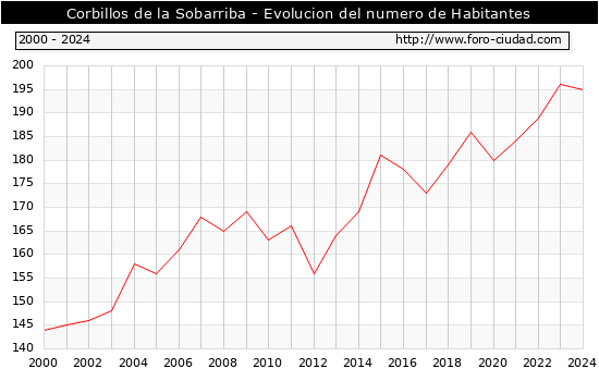 Segun los datos publicados por el INE a 1 de Enero de 2024 el numero de habitantes en Corbillos de la Sobarriba era de 195, 1 habitantes menos que el en el año 2023. En el grafico siguiente se puede ver cuantos habitantes tiene Corbillos de la Sobarriba a lo largo de los años.