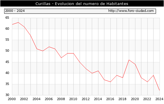 el numero de habitantes en Curillas era de 32, 7 habitantes menos que el en el año 2023. En el grafico siguiente se puede ver cuantos habitantes tiene Curillas a lo largo de los años.