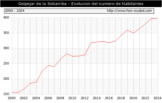 el numero de habitantes en Golpejar de la Sobarriba era de 397, 1 habitantes menos que el en el año 2023. En el grafico siguiente se puede ver cuantos habitantes tiene Golpejar de la Sobarriba a lo largo de los años.