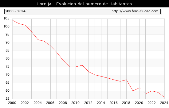 el numero de habitantes en Hornija era de 56, 3 habitantes menos que el en el año 2023. En el grafico siguiente se puede ver cuantos habitantes tiene Hornija a lo largo de los años.