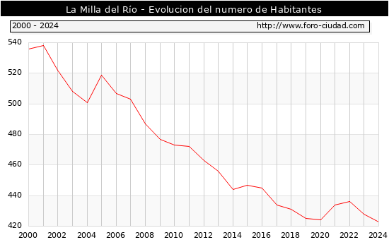 Segun los datos publicados por el INE a 1 de Enero de 2024 el numero de habitantes en La Milla del Río era de 423, 5 habitantes menos que el en el año 2023. En el grafico siguiente se puede ver cuantos habitantes tiene La Milla del Río a lo largo de los años.