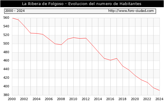 el numero de habitantes en La Ribera de Folgoso era de 391, 6 habitantes menos que el en el año 2023. En el grafico siguiente se puede ver cuantos habitantes tiene La Ribera de Folgoso a lo largo de los años.
