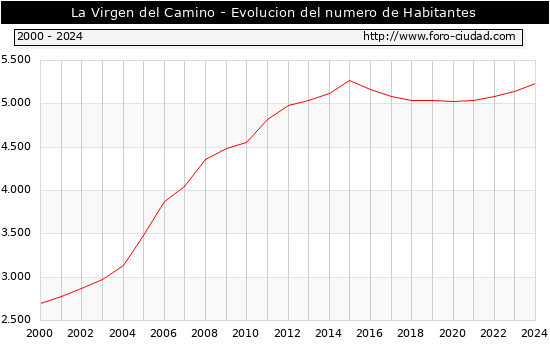 el numero de habitantes en La Virgen del Camino era de 5.229, 81 habitantes mas que el en el año 2023. En el grafico siguiente se puede ver cuantos habitantes tiene La Virgen del Camino a lo largo de los años.