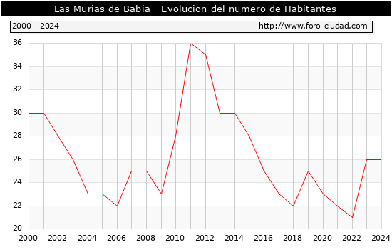 el numero de habitantes en Las Murias de Babia era de 26, igual numero de habitantes que el en el año 2023. En el grafico siguiente se puede ver cuantos habitantes tiene Las Murias de Babia a lo largo de los años.