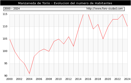 el numero de habitantes en Manzaneda de Torío era de 110, 5 habitantes menos que el en el año 2023. En el grafico siguiente se puede ver cuantos habitantes tiene Manzaneda de Torío a lo largo de los años.