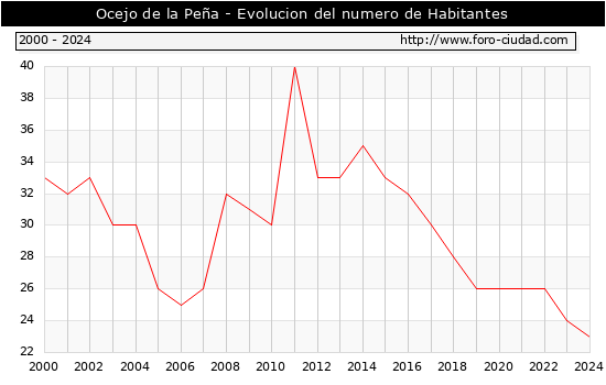 el numero de habitantes en Ocejo de la Peña era de 23, 1 habitantes menos que el en el año 2023. En el grafico siguiente se puede ver cuantos habitantes tiene Ocejo de la Peña a lo largo de los años.