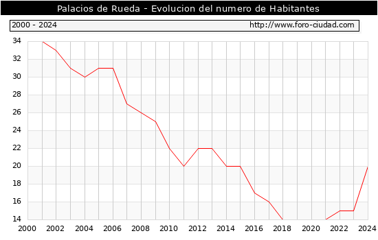 el numero de habitantes en Palacios de Rueda era de 20, 5 habitantes mas que el en el año 2023. En el grafico siguiente se puede ver cuantos habitantes tiene Palacios de Rueda a lo largo de los años.
