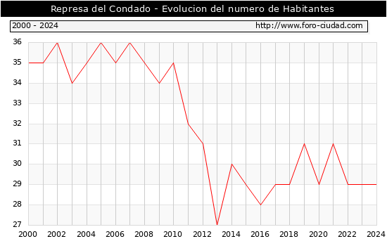 Segun los datos publicados por el INE a 1 de Enero de 2024 el numero de habitantes en Represa del Condado era de 29, igual numero de habitantes que el en el año 2023. En el grafico siguiente se puede ver cuantos habitantes tiene Represa del Condado a lo largo de los años.