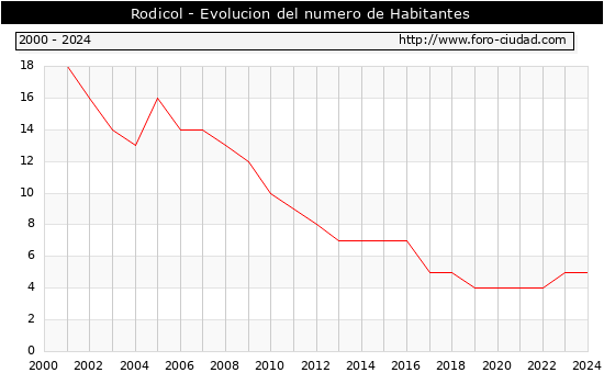 el numero de habitantes en Rodicol era de 5, igual numero de habitantes que el en el año 2023. En el grafico siguiente se puede ver cuantos habitantes tiene Rodicol a lo largo de los años.