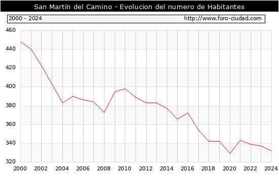 el numero de habitantes en San Martín del Camino era de 332, 5 habitantes menos que el en el año 2023. En el grafico siguiente se puede ver cuantos habitantes tiene San Martín del Camino a lo largo de los años.