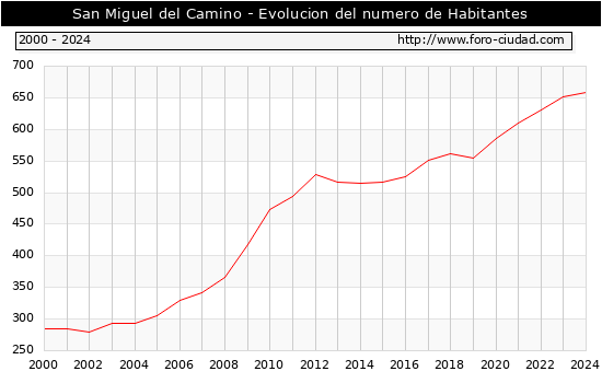 el numero de habitantes en San Miguel del Camino era de 658, 6 habitantes mas que el en el año 2023. En el grafico siguiente se puede ver cuantos habitantes tiene San Miguel del Camino a lo largo de los años.