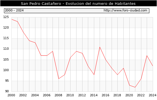 el numero de habitantes en San Pedro Castañero era de 102, 5 habitantes menos que el en el año 2023. En el grafico siguiente se puede ver cuantos habitantes tiene San Pedro Castañero a lo largo de los años.