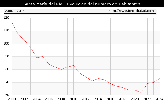 el numero de habitantes en Santa María del Río era de 73, 3 habitantes mas que el en el año 2023. En el grafico siguiente se puede ver cuantos habitantes tiene Santa María del Río a lo largo de los años.