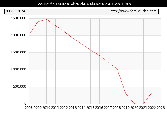 Valencia de Don Juan - Deuda viva del Ayuntamiento a 31/12/2024 Valencia de Don Juan - Deuda viva del Ayuntamiento a 31/12/2024 Segun el Ministerio de Economia y Hacienda el Ayuntamiento de Valencia de Don Juan a 31/12/2024 posee una deuda de 315.000 € . La deuda viva a 31/12/2023 ascendia a 340.000 € por lo que en el ultimo año la deuda se redujo en -25.000 €. ![]()