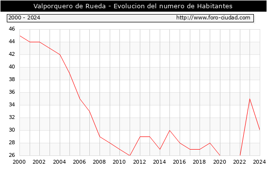el numero de habitantes en Valporquero de Rueda era de 30, 5 habitantes menos que el en el año 2023. En el grafico siguiente se puede ver cuantos habitantes tiene Valporquero de Rueda a lo largo de los años.