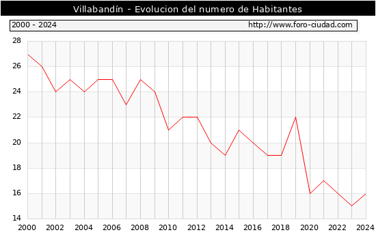 el numero de habitantes en Villabandín era de 16, 1 habitantes mas que el en el año 2023. En el grafico siguiente se puede ver cuantos habitantes tiene Villabandín a lo largo de los años.