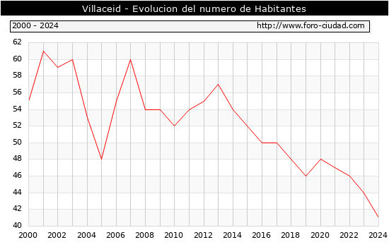 el numero de habitantes en Villaceid era de 41, 3 habitantes menos que el en el año 2023. En el grafico siguiente se puede ver cuantos habitantes tiene Villaceid a lo largo de los años.