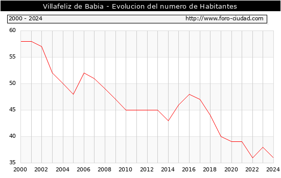 Segun los datos publicados por el INE a 1 de Enero de 2024 el numero de habitantes en Villafeliz de Babia era de 36, 2 habitantes menos que el en el año 2023. En el grafico siguiente se puede ver cuantos habitantes tiene Villafeliz de Babia a lo largo de los años.