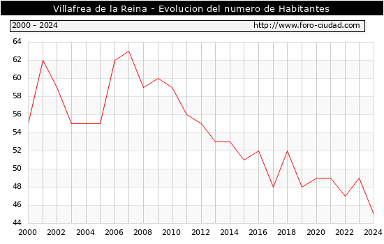 el numero de habitantes en Villafrea de la Reina era de 45, 4 habitantes menos que el en el año 2023. En el grafico siguiente se puede ver cuantos habitantes tiene Villafrea de la Reina a lo largo de los años.