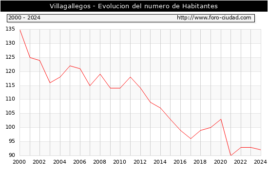 Segun los datos publicados por el INE a 1 de Enero de 2024 el numero de habitantes en Villagallegos era de 92, 1 habitantes menos que el en el año 2023. En el grafico siguiente se puede ver cuantos habitantes tiene Villagallegos a lo largo de los años.
