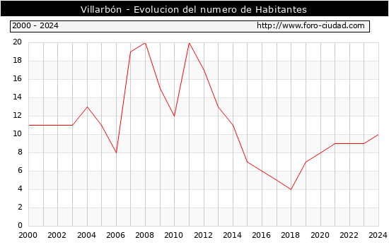 el numero de habitantes en Villarbón era de 10, 1 habitantes mas que el en el año 2023. En el grafico siguiente se puede ver cuantos habitantes tiene Villarbón a lo largo de los años.