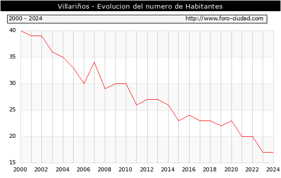 el numero de habitantes en Villariños era de 17, igual numero de habitantes que el en el año 2023. En el grafico siguiente se puede ver cuantos habitantes tiene Villariños a lo largo de los años.