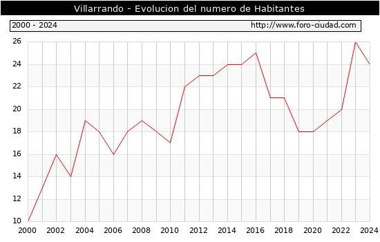 el numero de habitantes en Villarrando era de 24, 2 habitantes menos que el en el año 2023. En el grafico siguiente se puede ver cuantos habitantes tiene Villarrando a lo largo de los años.