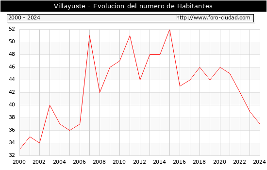 el numero de habitantes en Villayuste era de 37, 2 habitantes menos que el en el año 2023. En el grafico siguiente se puede ver cuantos habitantes tiene Villayuste a lo largo de los años.