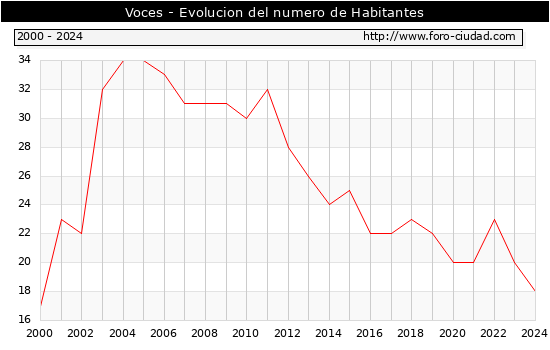 el numero de habitantes en Voces era de 18, 2 habitantes menos que el en el año 2023. En el grafico siguiente se puede ver cuantos habitantes tiene Voces a lo largo de los años.