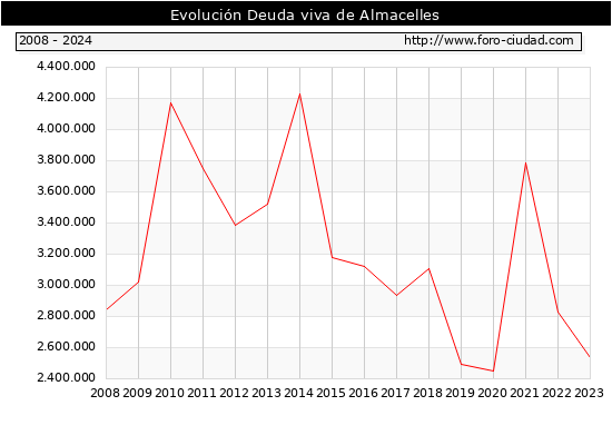 Almacelles - Deuda viva del Ayuntamiento a 31/12/2024 Almacelles - Deuda viva del Ayuntamiento a 31/12/2024 Segun el Ministerio de Economia y Hacienda el Ayuntamiento de Almacelles a 31/12/2024 posee una deuda de 2.076.000 € . La deuda viva a 31/12/2023 ascendia a 2.534.000 € por lo que en el ultimo año la deuda se redujo en -458.000 €. ![]()