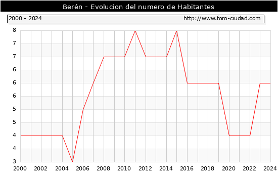 el numero de habitantes en Berén era de 6, igual numero de habitantes que el en el año 2023. En el grafico siguiente se puede ver cuantos habitantes tiene Berén a lo largo de los años.