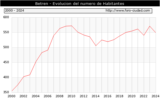 el numero de habitantes en Betren era de 549, 22 habitantes menos que el en el año 2023. En el grafico siguiente se puede ver cuantos habitantes tiene Betren a lo largo de los años.