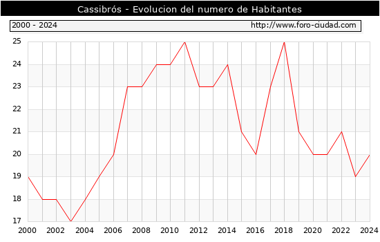 el numero de habitantes en Cassibrós era de 20, 1 habitantes mas que el en el año 2023. En el grafico siguiente se puede ver cuantos habitantes tiene Cassibrós a lo largo de los años.