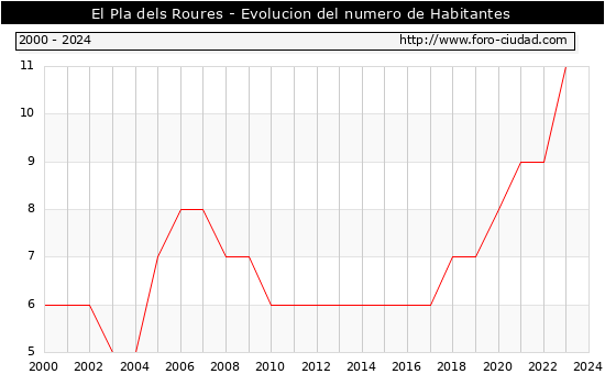 el numero de habitantes en El Pla dels Roures era de 11, igual numero de habitantes que el en el año 2023. En el grafico siguiente se puede ver cuantos habitantes tiene El Pla dels Roures a lo largo de los años.