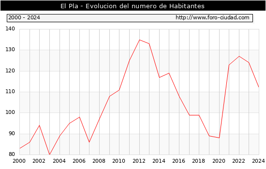el numero de habitantes en El Pla era de 112, 12 habitantes menos que el en el año 2023. En el grafico siguiente se puede ver cuantos habitantes tiene El Pla a lo largo de los años.