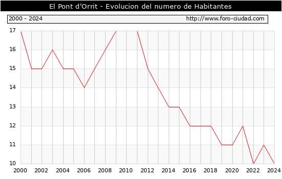 el numero de habitantes en El Pont d'Orrit era de 10, 1 habitantes menos que el en el año 2023. En el grafico siguiente se puede ver cuantos habitantes tiene El Pont d'Orrit a lo largo de los años.