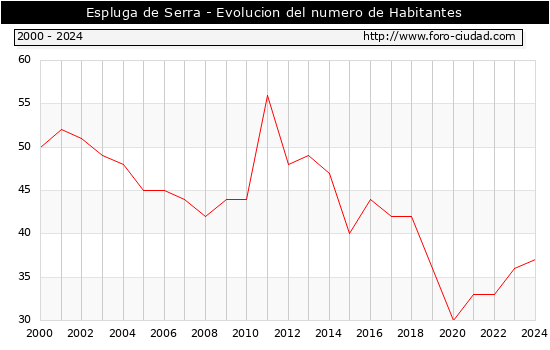 el numero de habitantes en Espluga de Serra era de 37, 1 habitantes mas que el en el año 2023. En el grafico siguiente se puede ver cuantos habitantes tiene Espluga de Serra a lo largo de los años.