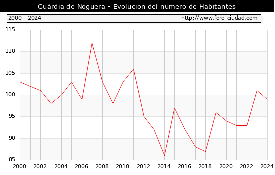 el numero de habitantes en Guārdia de Noguera era de 99, 2 habitantes menos que el en el aņo 2023. En el grafico siguiente se puede ver cuantos habitantes tiene Guārdia de Noguera a lo largo de los aņos.