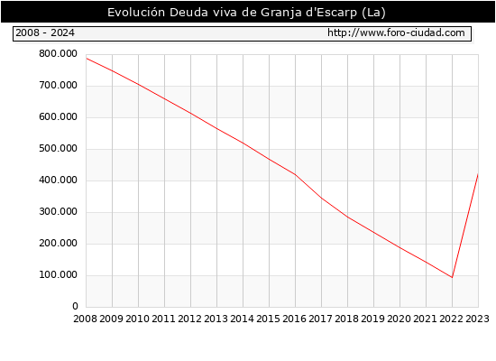 La Granja d'Escarp - Deuda viva del Ayuntamiento a 31/12/2024 La Granja d'Escarp - Deuda viva del Ayuntamiento a 31/12/2024 Segun el Ministerio de Economia y Hacienda el Ayuntamiento de La Granja d'Escarp a 31/12/2024 posee una deuda de 400.000 € . La deuda viva a 31/12/2023 ascendia a 425.000 € por lo que en el ultimo año la deuda se redujo en -25.000 €. ![]()