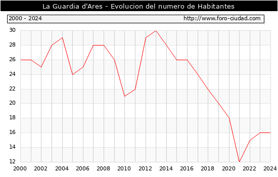 el numero de habitantes en La Guardia d'Ares era de 16, igual numero de habitantes que el en el año 2023. En el grafico siguiente se puede ver cuantos habitantes tiene La Guardia d'Ares a lo largo de los años.