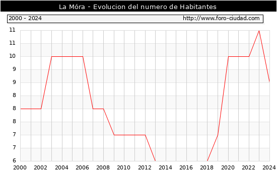 el numero de habitantes en La Móra era de 9, 2 habitantes menos que el en el año 2023. En el grafico siguiente se puede ver cuantos habitantes tiene La Móra a lo largo de los años.