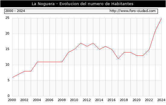 el numero de habitantes en La Noguera era de 25, 4 habitantes mas que el en el año 2023. En el grafico siguiente se puede ver cuantos habitantes tiene La Noguera a lo largo de los años.