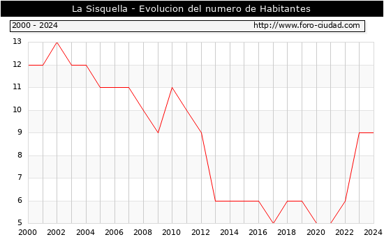 el numero de habitantes en La Sisquella era de 9, igual numero de habitantes que el en el año 2023. En el grafico siguiente se puede ver cuantos habitantes tiene La Sisquella a lo largo de los años.