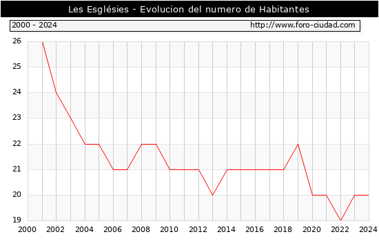 el numero de habitantes en Les Esglésies era de 20, igual numero de habitantes que el en el año 2023. En el grafico siguiente se puede ver cuantos habitantes tiene Les Esglésies a lo largo de los años.