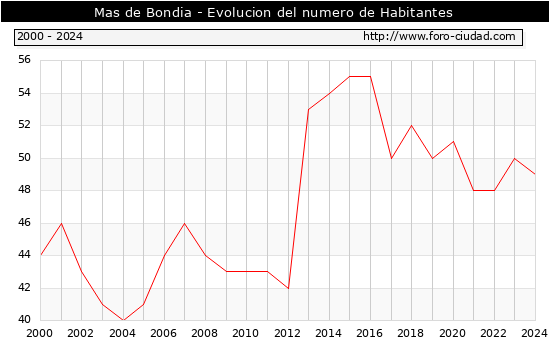 el numero de habitantes en Mas de Bondia era de 49, 1 habitantes menos que el en el año 2023. En el grafico siguiente se puede ver cuantos habitantes tiene Mas de Bondia a lo largo de los años.