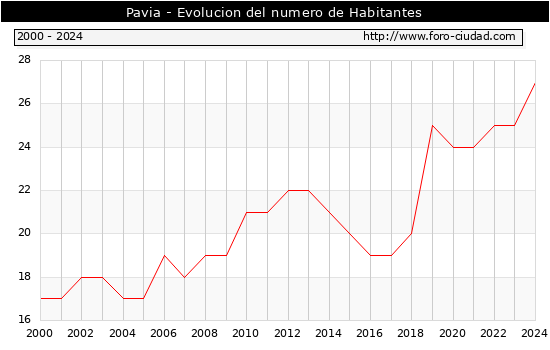 el numero de habitantes en Pavia era de 27, 2 habitantes mas que el en el año 2023. En el grafico siguiente se puede ver cuantos habitantes tiene Pavia a lo largo de los años.